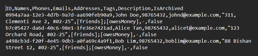 list -archived followed by unarchive 1 unarchives the 1st recruit in the archived listlist -all followed by unarchive 3 unarchives the 3rd recruit if they are archivedexportExport all recruits in the address book to a .csv file.