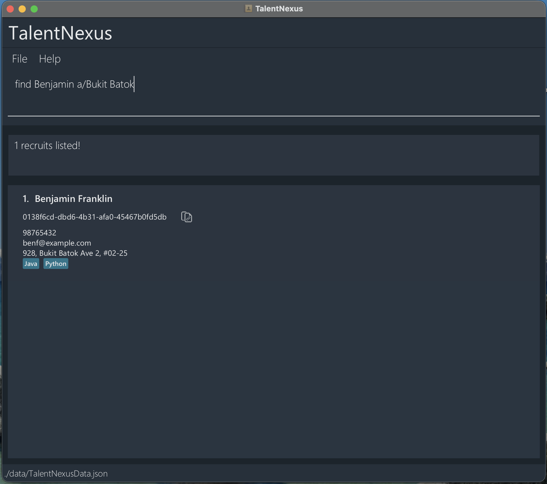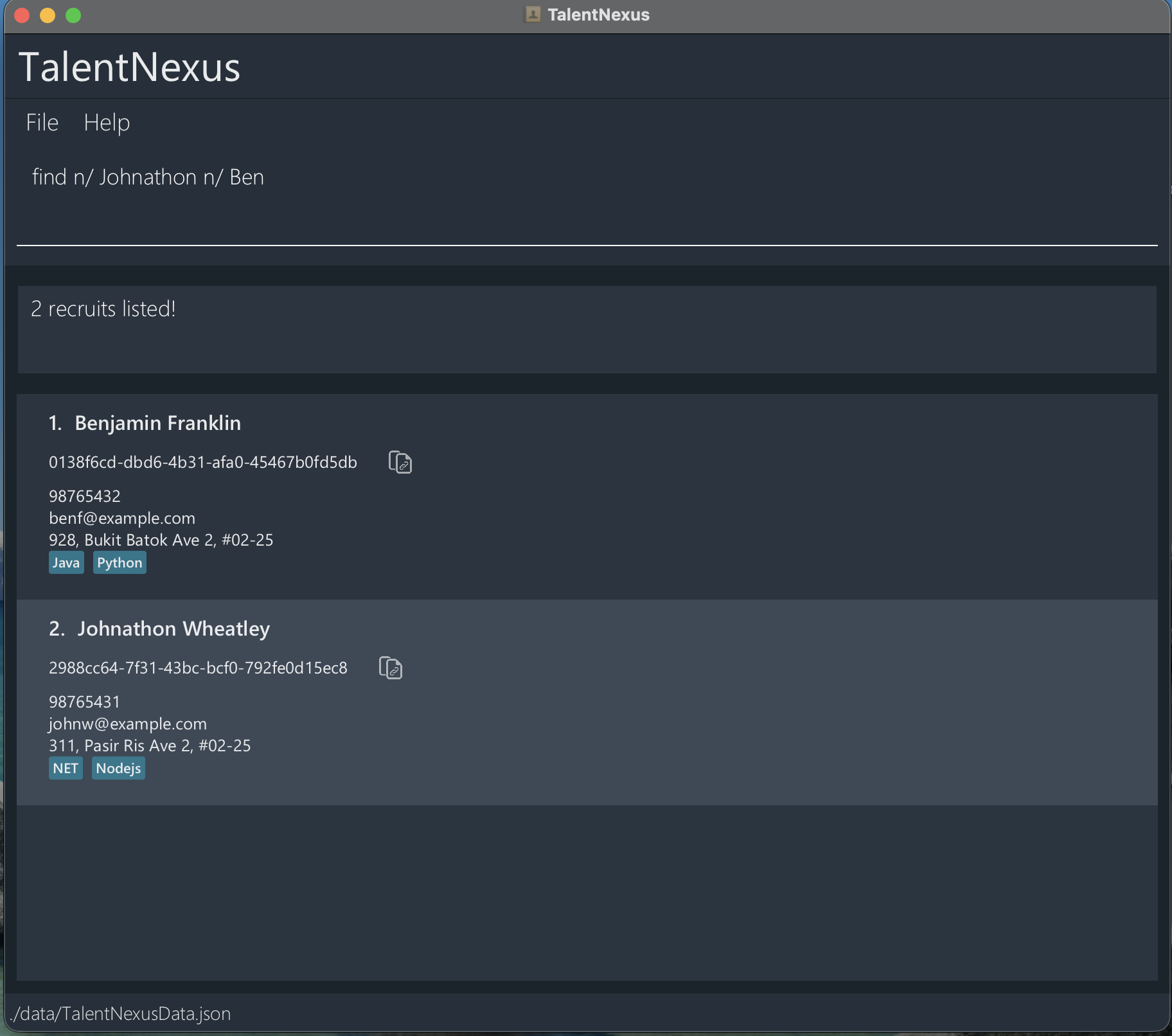 TalentNexus is a desktop app for managing recruits, optimized for use via a Command Line Interface (CLI) while still having the benefits of a Graphical User Interface (GUI). For avid keyboard users, TalentNexus can get contact management tasks done faster than traditional GUI apps.